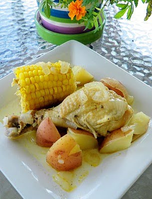 Add water, chicken broth, corn and potatoes to Dutch oven; sprinkle remaining 1 teaspoon seasoned salt evenly over top. Cover; cook 90 minutes or until juice of chicken is clear when thickest part is cut to bone (180°F). Remove chicken and corn to serving platter, using tongs. Gently stir potatoes with onions and pan juices; spoon onto serving platter. Sprinkle with parsley.