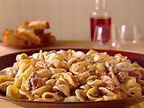 Continue cooking until the sausage is golden and the onions are tender. Add the beans and oregano cook for 2 more minutes. Add the cup of pasta cooking liquid and stir, scrapping up any brown bits from the bottom of the pan. Add the mascarpone cheese and stir until it dissolved into a light sauce. Add the salt, pepper, and hot pasta. Stir until coated and serve.