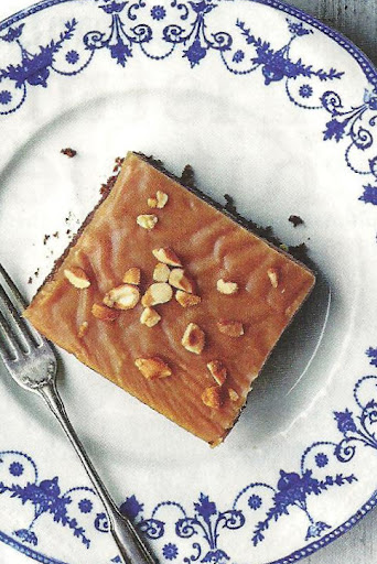 5. Prepare Peanut Butter Frosting. Melt butter in a large saucepan over medium heat. Whisk in milk and bring to a boil, whisking constantly. Reduce heat to low, and whisk in peanut butter until smooth. Gradually whisk in sugar until smooth; remove from heat and whisk in vanilla. Pour over warm cake. Sprinkle with chopped peanuts.