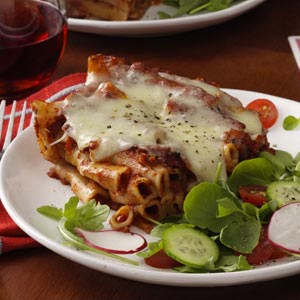 • Transfer to a 13-in. x 9-in. baking dish coated with cooking spray. Cover and bake at 350° for 1 hour. Top with cheese. Bake, uncovered, 4-6 minutes longer or until ziti is tender and cheese is melted.
