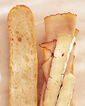 Slice baguette horizontally, and spread both sides with mustard. Layer one side with ham and brie, and top with the other half of the loaf. Slice the baguette into three 6-inch sandwiches.
