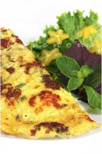 On high heat, heat 1 teaspoon of cooking oil in a nonstick frying pan and sautee a few pieces of pork–when it’s about 1/3rd of of the way done, add onion slices and shrimps since they are quicker to cook. Distribute the shrimps and pork evenly prior to adding the batter. Don’t use too much filling–you don’t want to overload the crepes.