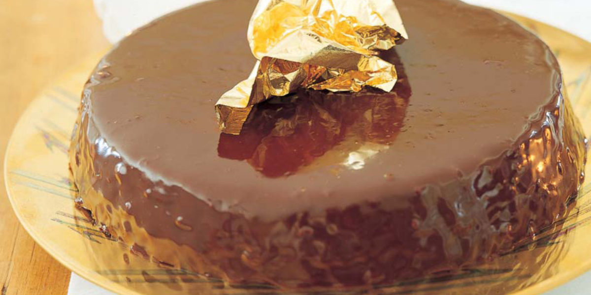 Place the cake upside down on a wire rack and pour the glaze evenly over the top, making sure to cover the entire cake and sides. You can tilt the rack to smooth the glaze. Decorate with candied violets, if desired, or gently crumble the gold leaf and place it on the center of the cake. Do not refrigerate.