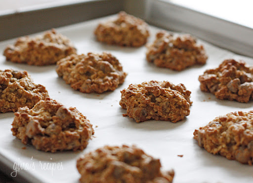Drop heaping tablespoonfuls (approx 1 tbsp each) of the dough onto prepared baking sheets, flattening each cookie slightly (I forgot to do this). Bake for about 10-12 minutes, or until cookies become light brown at the edges.
