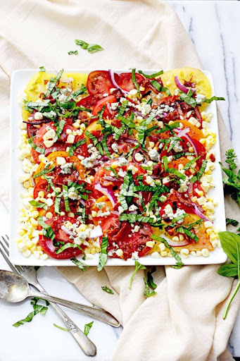 Juicy, sweet, and fresh, these tomatoes combined with salty bacon, bright tangy red wine vinegar, blue cheese, and basil make for a delicious and beautiful summer salad.
