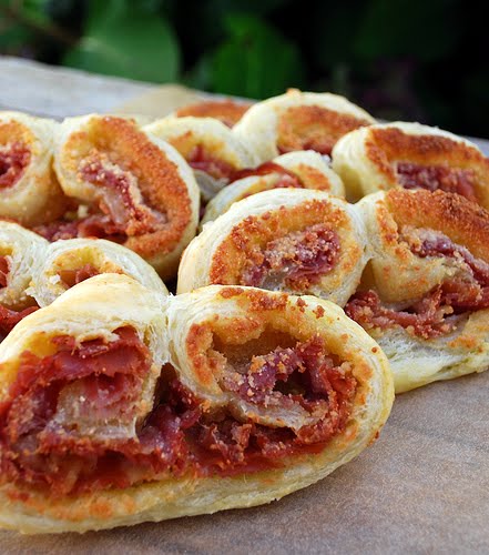 Unfold the puff pastry and spread it with the mustard. Leave a ½ border when you are spreading the mustard. Lay the proscuitto and cheese over the mustard. Roll up one side to the middle of the dough: roll up the other side to the middle so the two rolls meet in the center. Using a serrated knife cut into ½" inch slices.