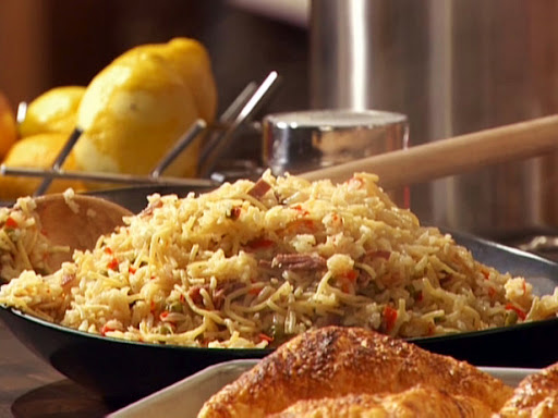 In a large saucepan or skillet with a lid, heat oil and butter over medium-high heat. Add in the vermicelli and rice and saute until lightly browned. Add in prosciutto and saute 2 minutes more. Stir in onion and peppers, and saute for another 2 minutes. Add the garlic and peas, saute for 1 more minute and deglaze with white wine. Pour in the chicken stock, bring mixture to a simmer, cover and cook for 18 to 20 minutes or until liquid is absorbed and rice is cooked. Season with salt and pepper, if needed. Transfer to a serving bowl and serve immediately.