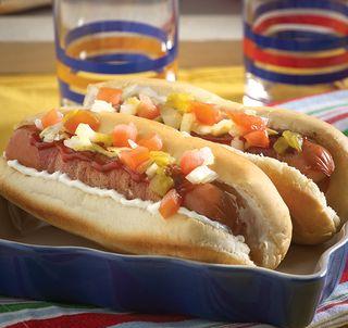 Remove wire twist from hot dog bun bag. Microwave buns in bag for 30 to 45 seconds. Carefully remove buns from bag; cut open buns. Spread sour cream on both halves of each bun. Place bacon-wrapped hot dog in bun. Top with onion, tomato and jalapeños. Garnish with mustard and catsup.