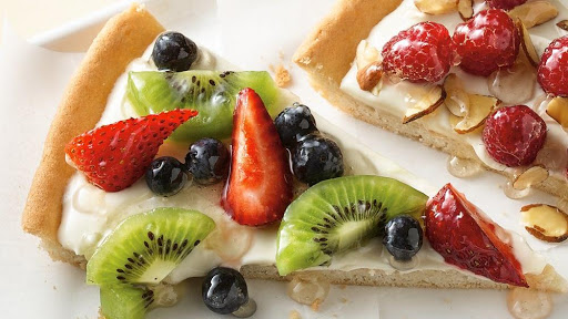 In small bowl, beat cream cheese, sugar and vanilla with electric mixer on medium speed until fluffy. Spread mixture over cooled crust. Arrange fruit over cream cheese. Stir jelly until smooth; spoon or brush over fruit. Refrigerate until chilled, at least 1 hour. To serve, cut into wedges or squares. Cover and refrigerate any remaining pizza.