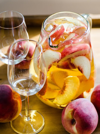Put brandy & 3/4 of peaches in pitcher and lightly muddle. Add Moscato and seltzer and stir gently with wooden spoon. Pour in ice filled glass. Garnish with peaches.