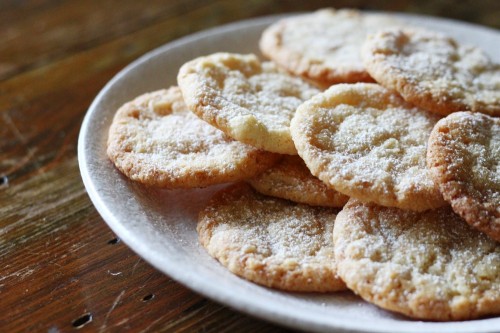 Roll a scant tablespoon of dough at a time into a ball then flatten slightly and place 2″ apart on ungreased cookie sheets. Bake for about 8-10 minutes, or until edges are golden.