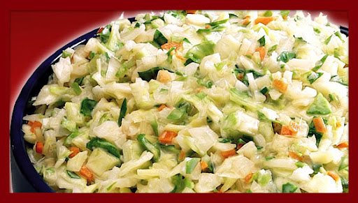 We take shredded cabbage, diced carrots, and just a sprinkle of onions and mix them all in a delicious dressing for what a lot of folks consider to be the world's best cole slaw.