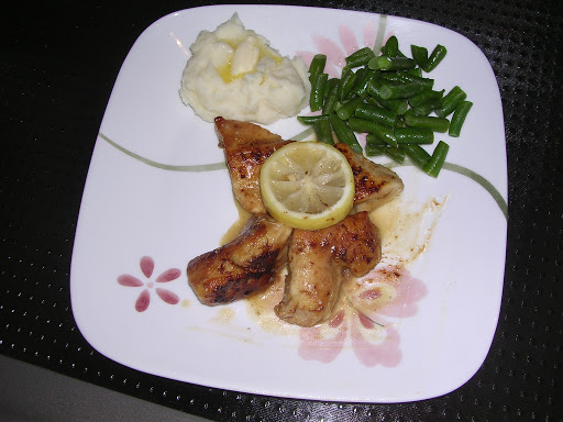 Mix flour, salt and pepper. Coat chicken with this. Reserve any flour leftover for gravy. In a skillet heat 3T butter. Fry chicken until it is browned. Remove from pan. Reduce heat to low and in drippings stir in remaining flour, water, boullion, and half of a lemon. Stir to loosen brown bits. Return chicken to skillet. Top chicken with thinly sliced lemons. Cover and simmer 5 minutes.