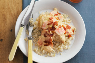STIR in broth and Neufchatel; cook, uncovered, 2 min. or until Neufchatel is melted and sauce is thickened, stirring frequently. Return chicken to skillet; cook 2 min. or until heated through. Spoon rice onto serving plate; top with chicken, sauce and bacon.