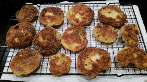 Heat oil in electric skillet to 375. Fry tomatoes for several minutes until brown on bottom. Turn, and fry until brown. DO NOT TURN MORE THAN ONCE (makes them greasy). Remove and lay on rack to drain.