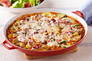 SPREAD 1 cup spaghetti sauce onto bottom of skillet; top with small spoonfuls of ricotta mixture, cooked vegetables, remaining spaghetti sauce and mozzarella. Cover.
