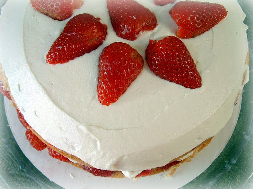 Using large serrated knife, slice cake into three even layers. Place bottom layer on cardboard round or cake plate and arrange ring of 20 strawberry halves, cut sides down and stem ends facing out, around perimeter of cake layer.