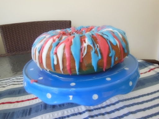 Heat oven to 350°F. Generously grease 12-cup fluted tube cake pan. Make cake batter as directed on box, using water, oil and egg whites. Pour 1 cup of the batter into small bowl; stir in red food color until well mixed. Pour another cup of the batter into separate bowl; stir in blue food color until well mixed.