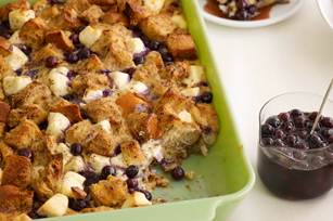 BRING remaining syrup and blueberries to boil in saucepan, stirring constantly; simmer on medium-low heat 1 min., stirring constantly. Serve over individual servings of strata.