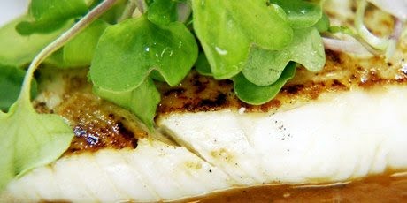 4. Ladle a pool of Smoked Tomato Vinaigrette in the bottom of a deep plate, top with a piece of halibut and add a few baby greens on top. You can use arugula mixed with sliced shallots or many kinds of young sprouts would also work great.