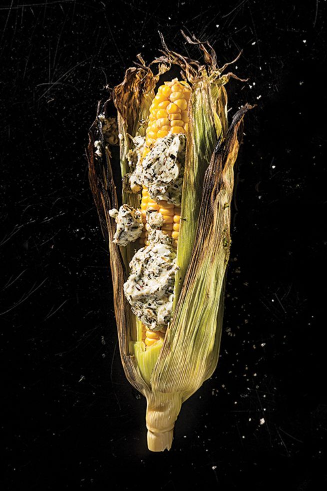 Heat a charcoal grill or set a gas grill to high; bank coals or turn off burner on one side (see "Grilling 101"). Grill corn on cooler side of the grill until husks are slightly charred and kernels are tender, 5–10 minutes. Peel husks and smear with butter.