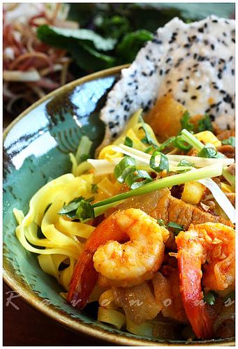 This noodle dish is a complex mixture of flavors and texture. The vibrant wide yellow tumeric noodles, sesame rice crackers, roasted peanuts, fresh herbs, and flavorful but light broth sets mì Quảng apart from other Vietnamese noodle soups like pho and bun bo hue. Unlike these noodle soups, mì Quảng is served with very little broth and almost like a dry noodle dish or noodle salad with the broth serving to bring all the flavors together.