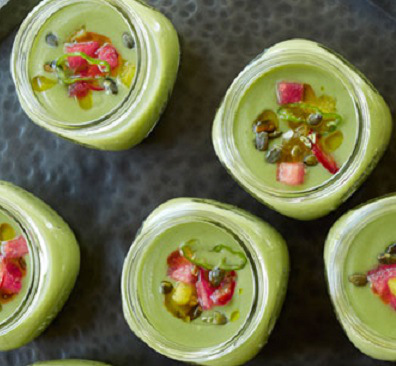 Before serving, taste soup and adjust seasonings, if needed. Divide soup between chilled bowls and top evenly with watermelon, reserved chopped mint and a drizzle of olive oil.
