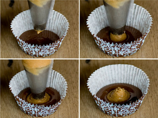 Arrange 28 cupcake liners on a sheet tray. Fill each with a half ounce of chocolate. Then use the pastry bag to pipe about three quarters of an ounce off filling directly into the center of each. This will force the chocolate away from the center and up the sides of each cup.