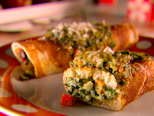 Preheat the oven to 350 degrees F. Lightly grease a 9 by 12-inch baking dish (or individual baking dishes). Using about half the vegetable mixture fill the pancakes. Lay pancake down on a work surface, top with 2 spoonfuls of vegetable mixture, sprinkle with some mozzarella cheese. Roll up the pancake around the vegetable mixture and place in the baking dish. Continue with the remaining pancakes, placing in the baking dish in 2 rows, and using up all the shredded mozzarella cheese.