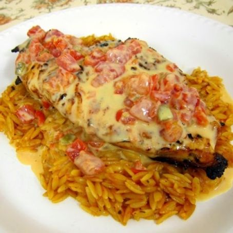 Grilled Tex-Mex chicken smothered in queso and served over a well seasoned southwestern orzo. Yum-ilicious!