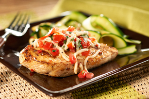 TURN chicken over; place on foil. Top with tomato mixture. Grill 8 min. or until chicken is done (165ºF).