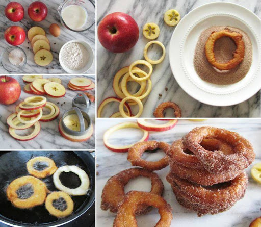 In a large bowl, combine the flour, baking powder, sugar, salt and ⅛ teaspoon cinnamon. Set aside. In a small bowl combine the egg and buttermilk. In a third dish, make your cinnamon-sugar topping by combining the ⅓ cup sugar and 2 teaspoons cinnamon. Set that aside too. Next, slice the apples into ¼-inch thick slices, and use circle biscuit cutters in graduated sizes to make rings out of each slice. Discard the center circles containing the apple core. Heat the oil in a frying pan over medium heat to 350°F. Combine the contents of the first and second dishes as the oil warms up. This will be your batter. Dip the apple rings in and out of the batter one at a time, removing any dripping excess by tapping the rings against the side of the bowl. Fry the rings in small batches, turning them to ensure browning on both sides. Once the rings are golden and crispy, transfer them to a plate lined with paper towel for a few seconds. Quickly transfer the apple rings, one by one, into the cinnamon-sugar mixture and coat evenly. Transfer to a wire rack and serve warm. Notes Apples can go a long way in the recipe, so if you don't get to all 4 apples, don't worry. Make as much or as little as you like.
