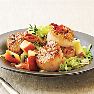 2. Heat a large, heavy skillet over high heat. Add oil to pan; swirl to coat. Sprinkle scallops with 1/4 teaspoon salt and remaining 1/4 teaspoon black pepper. Add scallops to pan; cook 3 minutes on each side or until scallops are done. Place about 1 cup cabbage mixture on each of 4 plates. Arrange 4 scallops on each serving. Sprinkle each serving with 1/2 teaspoon dill.