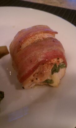 Pound chicken breast strips so that the chicken is about a 1/4-1/2 inch thick. Season both sides of chicken with salt, pepper and cheyenne pepper. Then place stuffing mixture in center of each chicken breast and roll into a cylinder shape. Finally wrap chick breast with 1 strip of bacon each. To ensure the stuffing mixture doesn't leak entirely out, it would be wise to either tie off the ends with baking string, or close them off with toothpicks.