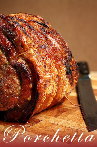 When the skin is golden brown, turn the oven to high broil. Place the porchetta as close as possible to the heating element and within minutes, the skin will become bubbly and crackle. Rotate as necessary to make sure skin is evenly bubbled and crackly. Do not leave the porchetta unattended. When finished, you can double check the internal tempurature of the loin with meat thermometer (145 for medium). Allow porchetta to rest about 15-20 minutes before carving. After carving, it's also helpful to crack the pieces of skin with the the tip of your knife for easier consumption.