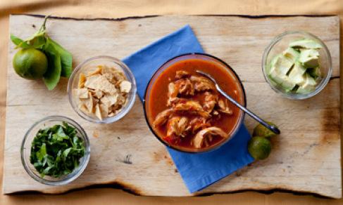 Serve topped with crumbled chips, cilantro, avocados, and a squeeze of lime.