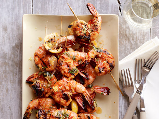 Using kitchen shears, cut through the shrimp shells along the outer curve, leaving the shells on. Remove the veins and rinse the shrimp. Add to the bowl with the lemongrass marinade and toss; cover and refrigerate for 1 hour. Meanwhile, soak 12 to 15 wooden skewers in water.