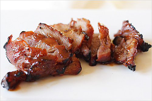 The next day, heat the oven to 375 degree F and roast the char siu for 15 minutes (shake off the excess char siu sauce before roasting). Transfer them out of the oven and thread the char siu pieces on metal skewers and grill them over fire (I used my stove top). Brush the remaining char siu sauce while grilling until the char siu are perfectly charred. Slice the char siu into bite-size pieces, drizzle the remaining char siu sauce over and serve immediately with steamed white rice.