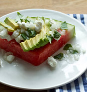 2. Place a watermelon slice on each plate and season with salt and pepper. Thinly slice each avocado half, maintaining each half’s natural shape. Season each half with sea salt and cracked pepper. Place one of each seasoned half on top of each watermelon slice.