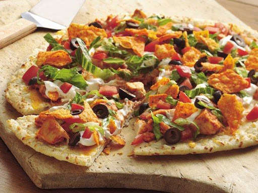 Drop sour cream by teaspoonfuls over pizza. Top with lettuce, tomato and tortilla chips. Cut into 8 wedges.