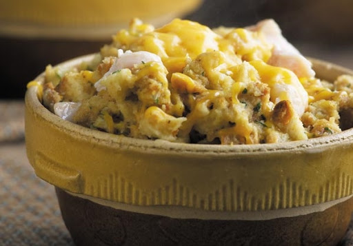 Prepare stuffing mix according to package directions; place in a slow cooker. Stir in 2 cans soup. In a separate bowl, stir together remaining soup, milk, and chicken. Add to slow cooker. Spread cheese over top. Cover and cook on low setting for 4 - 6 hours, or on high setting for 2 - 3 hours. Serves 6.