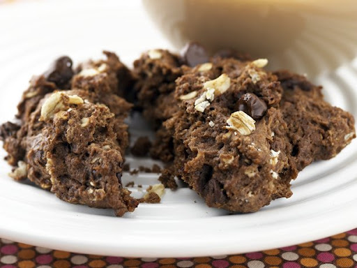 In a medium bowl combine flour, the 1/2 cup oats, sugar, cocoa powder, espresso powder, baking powder, and salt. Using a pastry blender, cut in butter until mixture resembles coarse crumbs. Make a well in the center of the flour mixture; set aside.