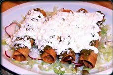 Sazona la pechuga con sal, pimienta, sazonador líquido y ajo. Cocina a la plancha y deshebra. Enrolla las tortillas calientes con la carne deshebrada y une los tacos por parejas con un palito de madera para que no se abran. Fríe en el aceite bien caliente hasta que doren. Sirve con salsa de tomate y el queso holandés rallado.