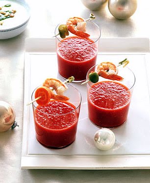 Pour Bloody Mary mixture into shot glasses or small glasses. Garnish each with shrimp-vegetable skewer. Serve remaining Bloody Mary mixture and shrimp-vegetable skewers alongside.