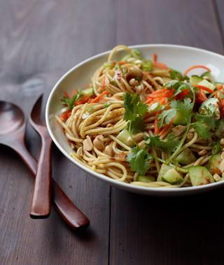 Meanwhile, in a small bowl, combine the oil, soy sauce, ginger, chili-garlic sauce, and salt. In a large bowl, combine the cucumbers, scallions, carrots, cilantro, and peanuts. Add the pasta and dressing and toss to combine.