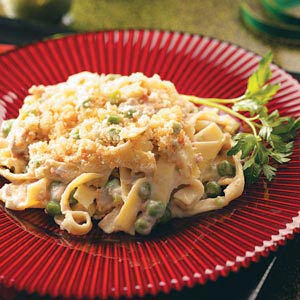 • Meanwhile, in a large bowl, combine the soup, sour cream, cheese, milk and salt. Stir in the tuna, peas, onion and pepper. Drain noodles; add to soup mixture.