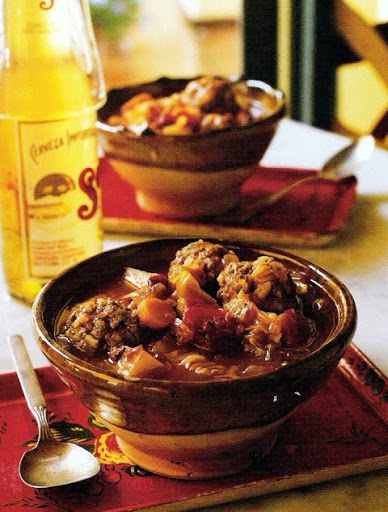 3. Heat pan over medium heat. Coat pan with cooking spray, Add cabbage, chopped onion, carrot, and celery to pan; cook 8 minutes, stirring frequently. Add the remaining cinnamon mixture, chili powder, and chipotle; cook 1 minute, stirring constantly. Stir in 1/4 tsp salt, broth, and tomatoes; bring to a boil. Reduce heat to simmer. Add meatballs; cover and cook 15 minutes. Add potato; cook, uncovered, over med heat 20 minutes or until the potato is tender.