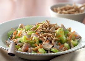 In large salad bowl, stir together chicken, lettuce, celery, carrot, walnuts, green onions and sesame seed until well mixed. Just before serving, pour dressing over salad; toss until coated. Top with chow mein noodles.