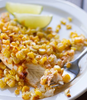 Tilapia is covered with a slightly spicy sauce that keeps it nice and moist with roasted corn on top for an amazingly easy summer supper. You can also use frozen corn and serve this year round!