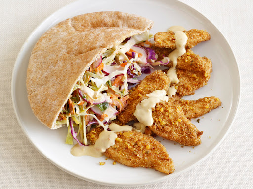Divide the chicken among plates and drizzle with the reserved hummus sauce. Stuff the slaw in the pitas and serve with the chicken.